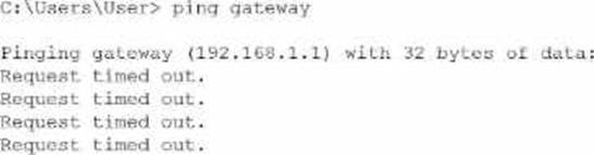 The user then pings the default gateway at 192.168.1.1, which should be the router―the device providing routing between local devices and outside networks. The repeated "Request timed out" responses indicate the workstation cannot reach the router at all. This type of failure points directly to a router outage, a powered-off router, a failed router interface, or a physical disconnection of the router from the switch.