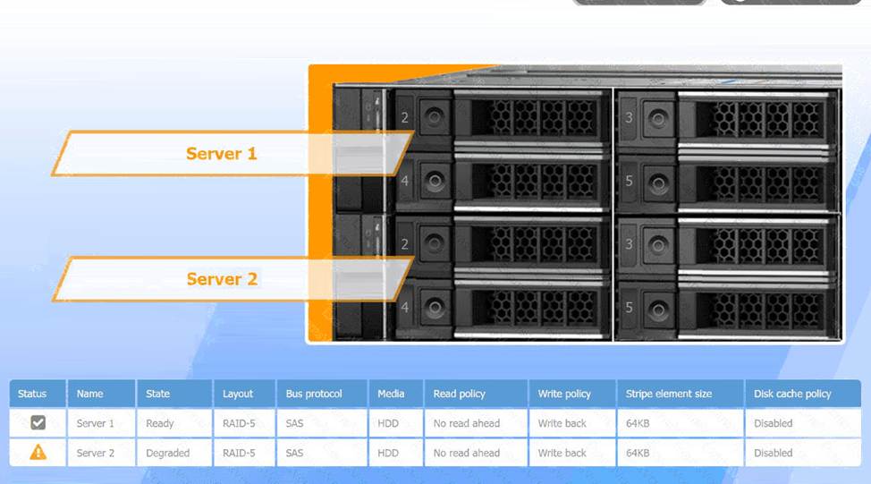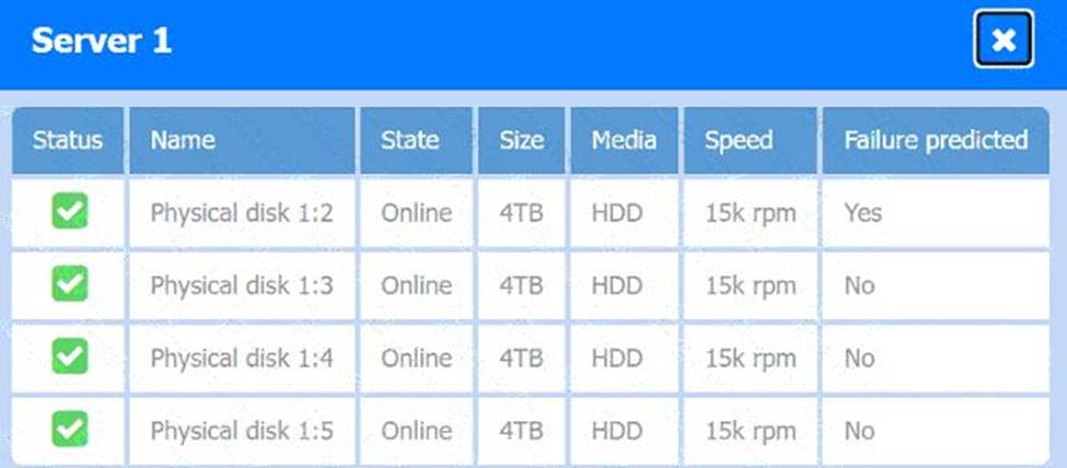 Click on Server 1 and Server 2 and review the information presented in each chart to determine which drives need to be replaced.