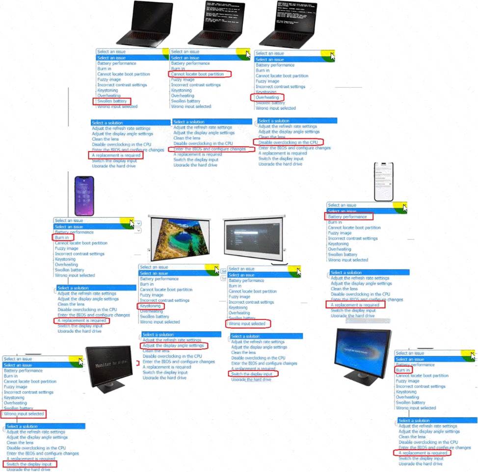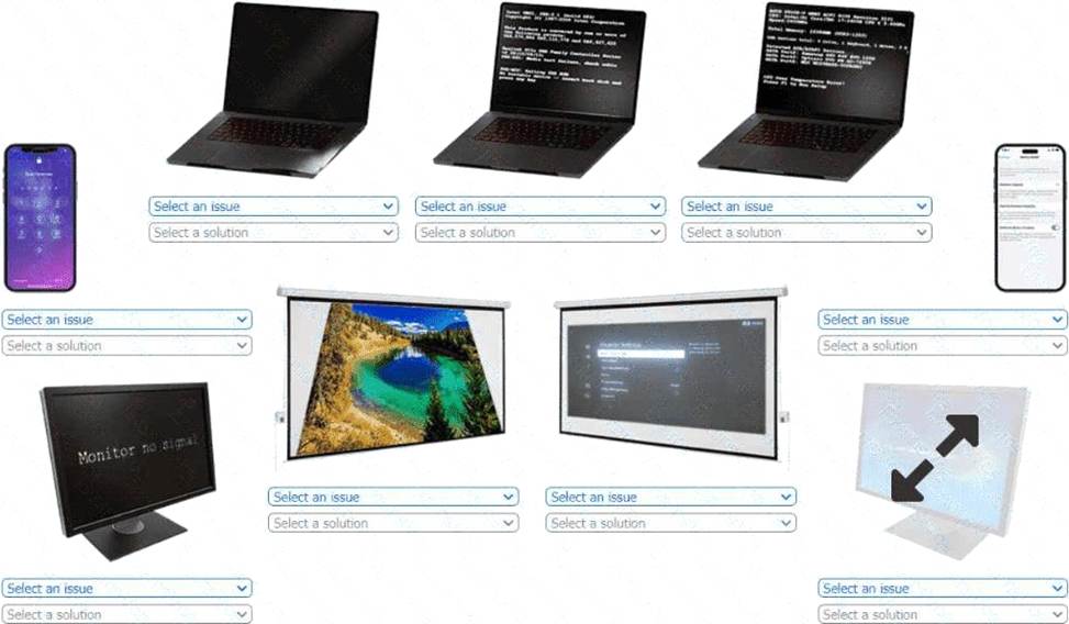 Click on each device to review the issue. Then select the appropriate issue and solution from the drop-down menu. Each option may be used more than once.