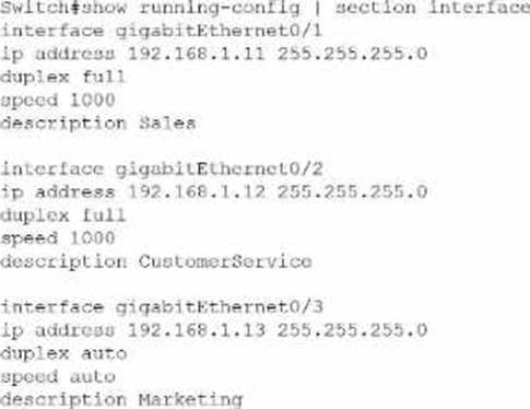 From the configuration, the Sales and Customer Service ports are hard-set to full duplex, 1000 Mbps, while the Marketing interface (GigabitEthernet0/3) is set to duplex auto and speed auto. CompTIA A+ explains that mismatched or lower-negotiated speeds and duplex settings can cause noticeable network slowdowns, collisions, and retransmissions―especially at busy times of the day when utilization is high.