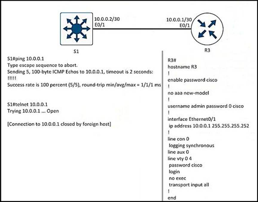 A network engineer cannot remote access R3 using Telnet from switch S1.