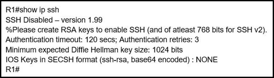 An engineer is trying to connect to a device with SSH but cannot connect. The engineer connects by using the console and finds the displayed output when troubleshooting.