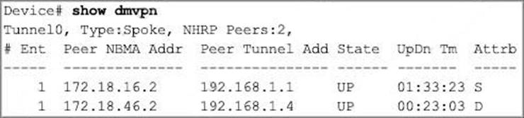 From the output we can see there are 2 NHRP Peers. The first one with the NBMA Address of 172.18.16.2 and the “Attribute” (Attrb) of Static (S) so we can deduce it is the Hub device. Therefore the second one must be the remaining Spoke device with the attribute of Dynamic (D).
