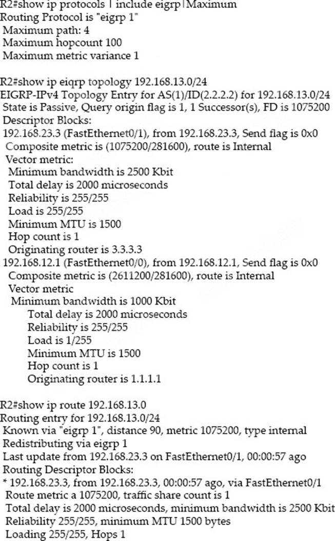 In other words, EIGRP will install all paths with metric < variance * best_metric into the local routing table, provided that it meets the feasibility condition to preventrouting loop. Therefore we can calculate the variance > metric / best_metric = 2611200 / 1075200 =2.4.