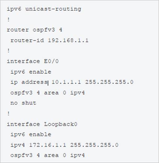 - D . Disable OSPF for IPv4 using the no ospfv3 4 area 0 ipv4 command under the E0/0 interface