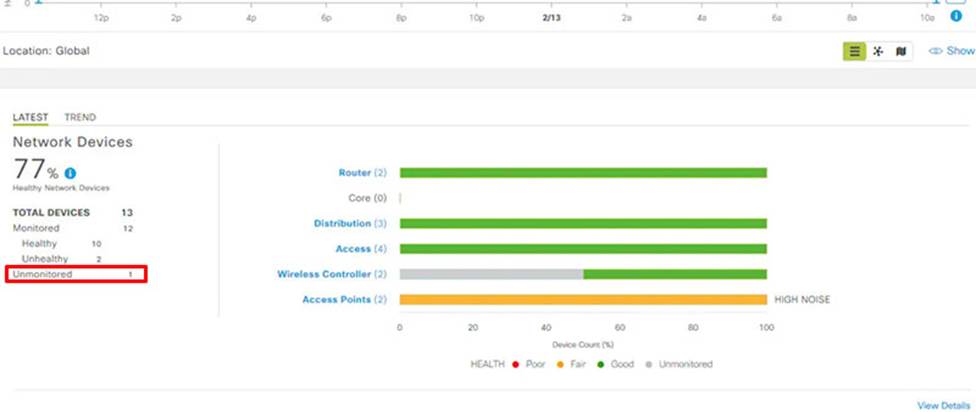 Unmonitored: Unmonitored devices are devices for which Assurance did not receive any telemetry data during the specified time range.
