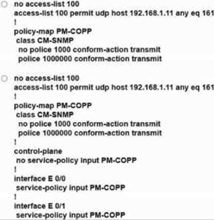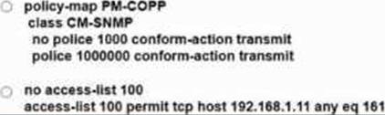 The network administrator configured CoPP so that all SNMP traffic from Cisco Prime located at 192.168.1.11 toward the router CPU is limited to 1000 kbps. Any traffic that exceeds this limit must be dropped.
