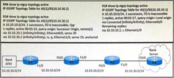 A bank ATM site has difficulty connecting with the bank server. A network engineer troubleshoots the issue and finds that R4 has no active route to the bank ATM site.