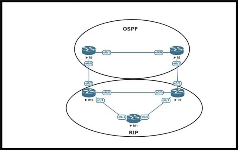 An engineer must configure OSPF with R9 and R10 and configure redistribution between OSPF and RIP causing a routing loop.