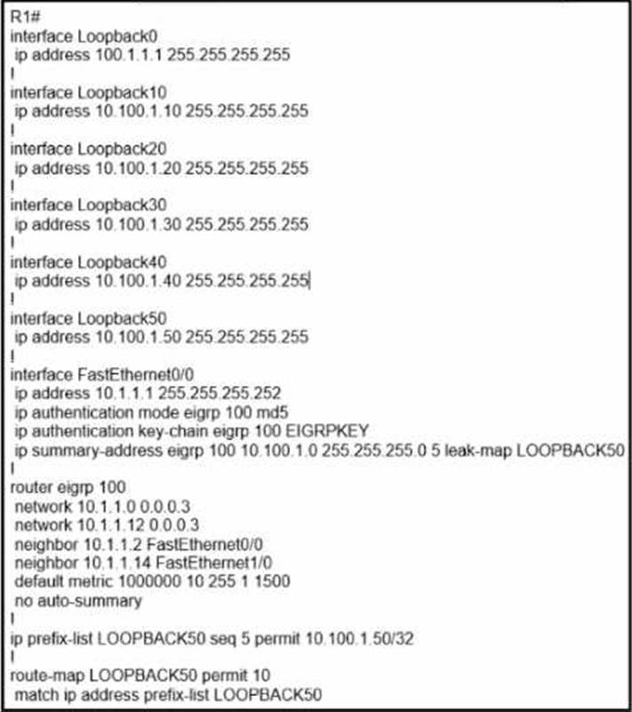 - C . Configure EIGRP 100 with a network statement for loopback 0 and remove the leak map for loopback 50.