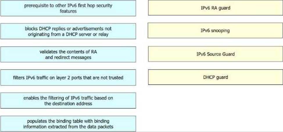 Drag and drop the descriptions from the left onto the IPv6 first hop security features on the right. Not all options are used.