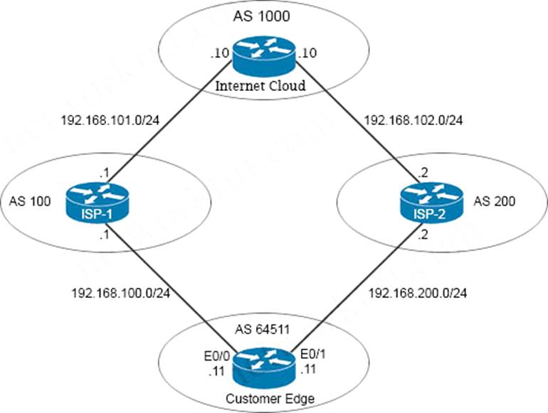 to send only summarized routes toward ISP-1 (AS 100) and ISP-2 (AS 200).