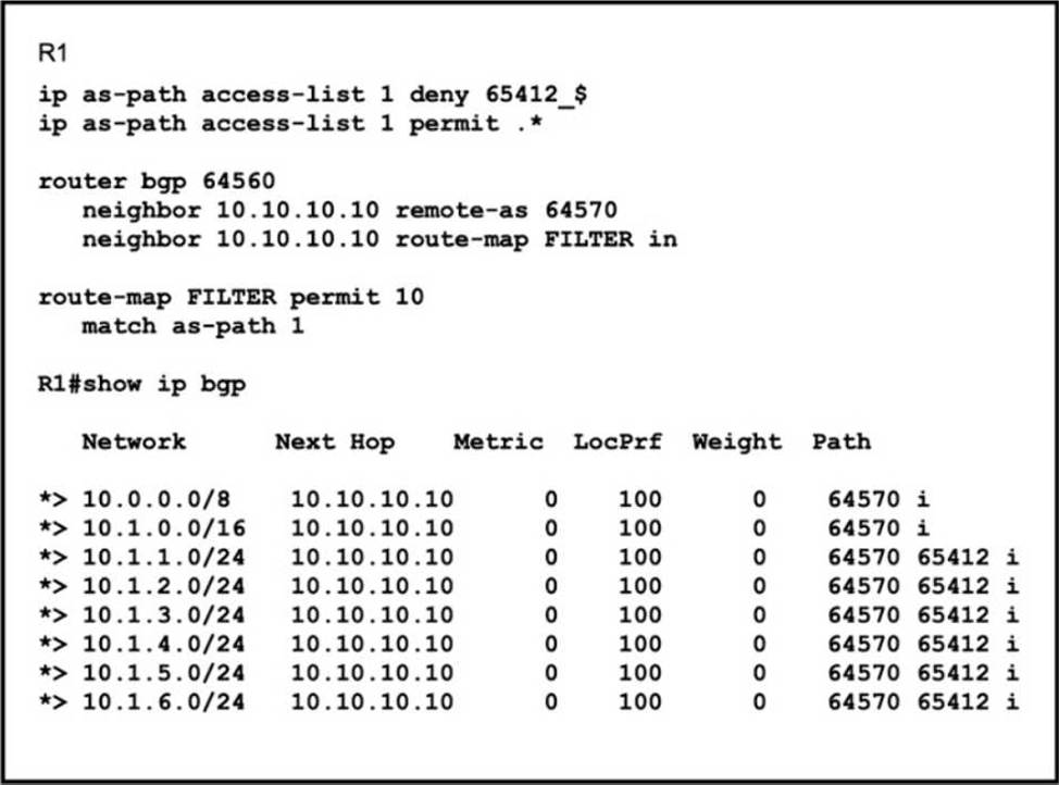 An engineer must filter prefixes that originate from AS65412. but it is not working correctly.