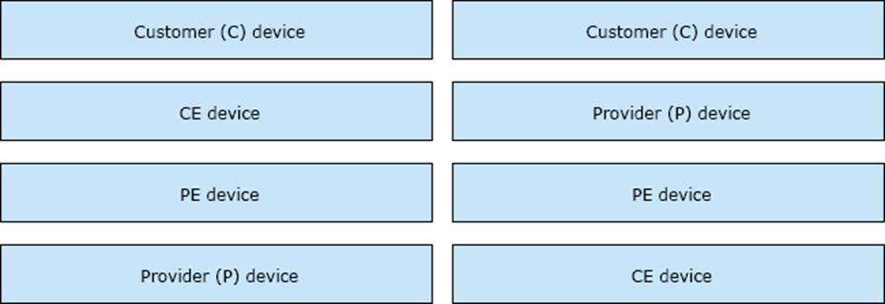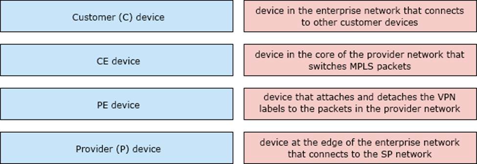 Drag and drop the MPLS VPN device types from the left onto the definitions on the right.