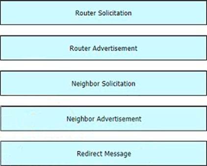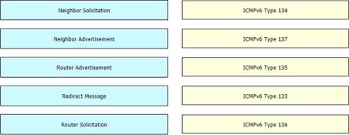 Drag and drop the ICMPv6 neighbor discovery messages from the left onto the correct packet types on the right.