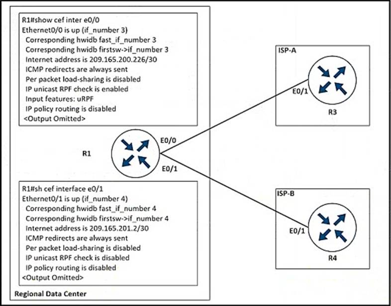 The company implemented uRPF to address an antispoofing attack. A network engineer received a call from the IT security department that the regional data center is under an IP attack Which configuration must be implemented on R1 to resolve this issue?