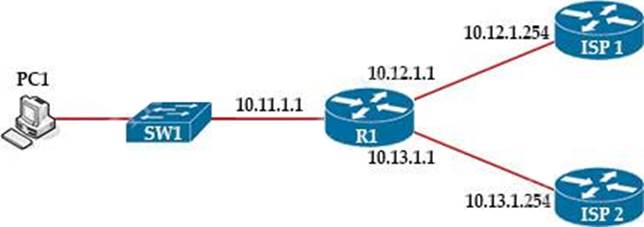 An engineer is monitoring reachability of the configured default routes to ISP1 and ISP2. The default route from ISP1 is preferred if available.