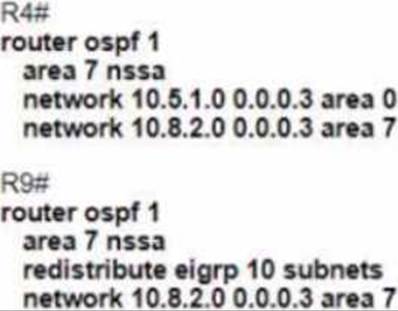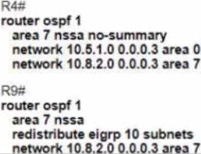 After an engineer modified the configuration for area 7 to permit type 1 2 and 7 LSAs only users connected to router R9 reported that they could no longer access the internet.