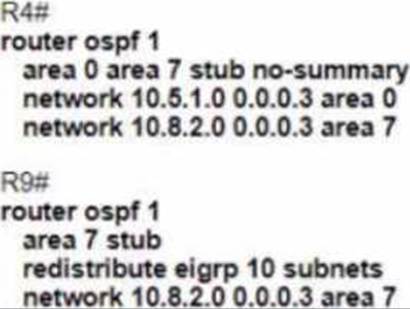 Option A configures area 7 as a stub area, which does not allow any external routes or type 7 LSAs in the area. This prevents R9 from learning the EIGRP routes and accessing the internet3.