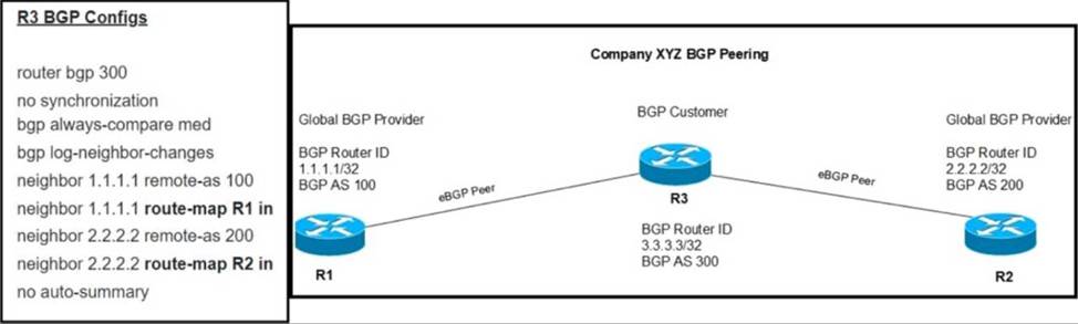 R3 is dual-homed to two service providers for traffic redundancy. R3 prefers its outbound traffic via R2.