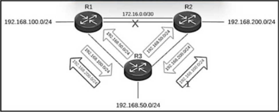 The primary link between R1 and R2 went down but R3 is still advertising the 192.166.200.0/24 network to R1 and the 192.166.100.0/24 network to R2, which creates a loop.