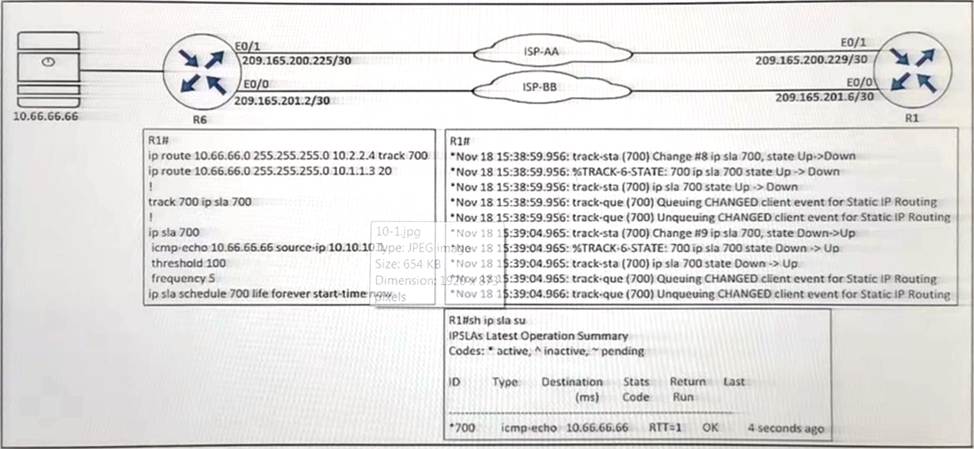 An engineer configured IP SLA on R1 to avoid the ISP link flapping problem. but it is not working as designed IP SLA should wait 30 seconds before switching traffic to a secondary connection and then revert to the primary link after waning 20 seconds, when the primary link is available and stabilized.