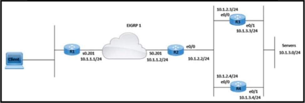 A network is configured for EIGRP equal-cost load balancing, but the traffic destined to the servers is not load balanced. Link metrics from router R2 to R3 and R4 are the same.