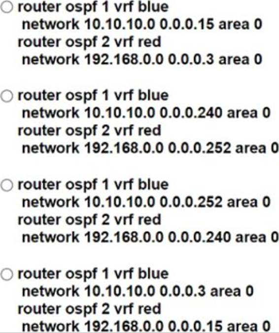 Which configuration forms OSPF neighbors over the network 10.10.10.0/28 for VRF blue and 192.168.0.0/30 for VRF red?