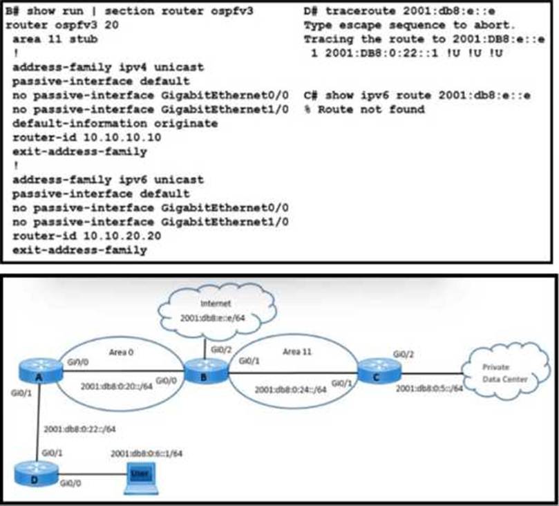 - C . Advertise the 2001:db8: e::e/64 route on the router D OSPF process.