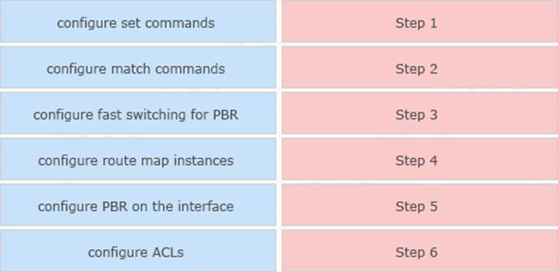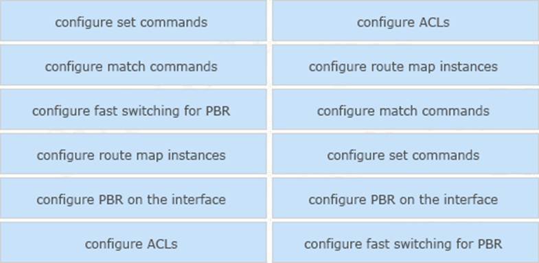 Drag and drop the actions from the left into the correct order on the right to configure a policy to avoid following packet forwarding based on the normal routing path.