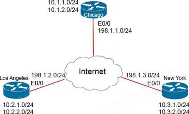 The Los Angeles and New York routers are receiving routes from Chicago but not from each other.