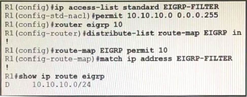 An engineer must filter incoming EIGRP updates to allow only a set of specific prefixes. The distribute list is tested, and it filters out all routes except network 10.10.10.0/24.