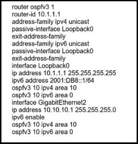 - A . Replace OSPF process 10 on the interfaces with OSPF process 1 and configure an additional router IO with IPv6 address