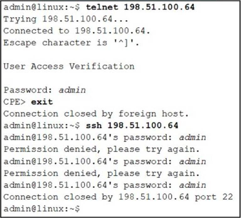 An administrator can log in to the device using Telnet but the attempts to log in to the same device using SSH with the same credentials fail.