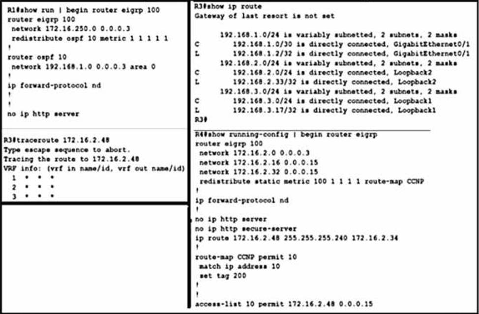 R1(config-router)#redistribute eigrp 100 subnets route-map CCNP - B . R1(config)#route-map CCNP permit 10