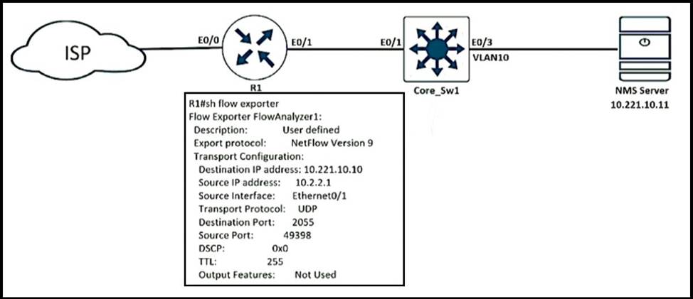 An engineer configured NetFlow on R1, but the NMS server cannot see the flow from R1.
