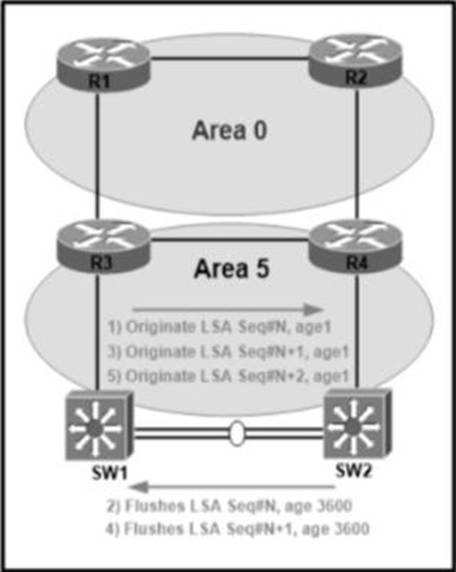 An error message "an OSPF-4-FLOOD_WAR” is received on SW2 from SW1. SW2 is repeatedly receiving its own link-state advertisement and flushes it from the network.