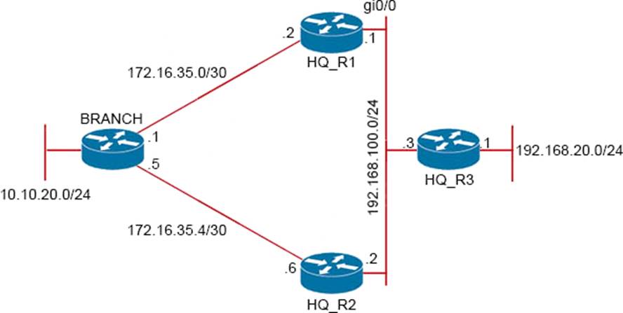 Traffic from the branch network should route through HQ R1 unless the path is unavailable. An engineer tests this functionality by shutting down interface on the BRANCH router toward HQ_R1 router but 192.168.20.0/24 is no longer reachable from the branch router.