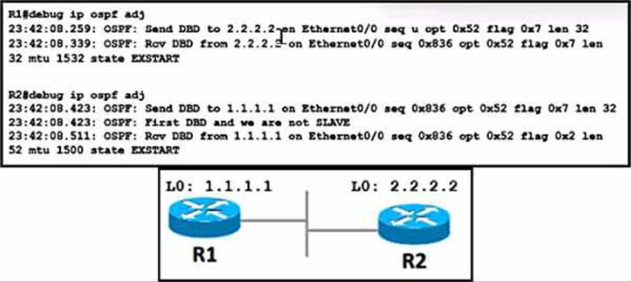 - A . Configure the mtu Ignore command on the Interfaces of R1 and R2