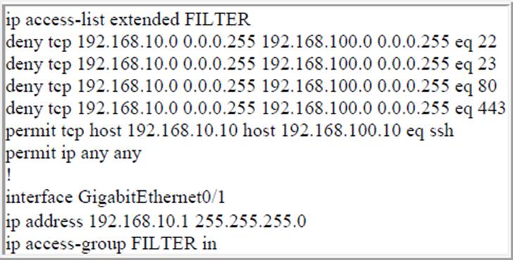 The ACL is placed on the inbound Gigabit 0/1 interface of the router. Host 192.168.10.10cannot SSH to host 192.168.100.10 even though the flow is permitted.