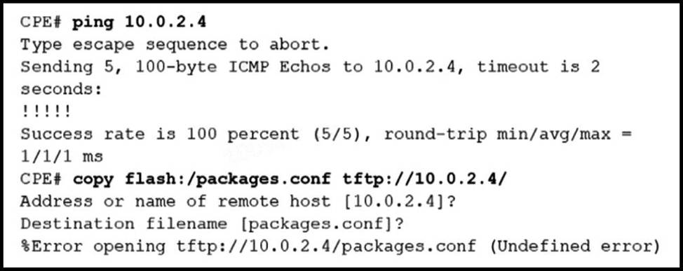 The administrator is trying to overwrite an existing file on the TFTP server that was previously uploaded by another router. However, the attempt to update the file fails.