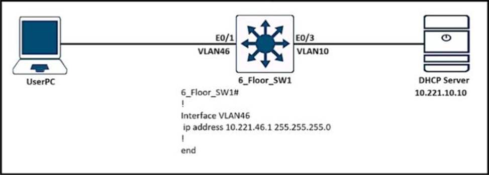 Users in VLAN46 cannot get the IP from the DHCP server. Assume that all the parameters are configured properly in VLAN 10 and on the DHCP server.
