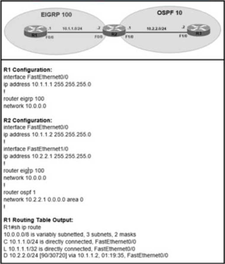 The R2 OSPF route 10 2 2 0/24 shows in the R1 EIGRP routing table without route redistribution performed between OSPF and EIGRP routing protocols.