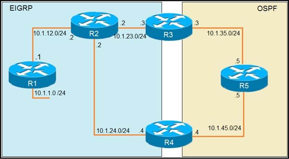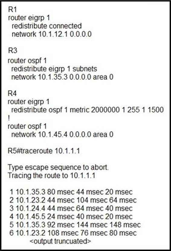 The reason for the loop is that R2 is forwarding the packets destined to 10.1.1.1 to R4, instead of R1. This is because in the redistribute OSPF statement, BW metric has a higher value and delay has a value of 1. So, R2 chooses R4 over R1 for 10.1.1.0/24 subnet causing a loop. Now, R5 learns 10.1.1.0/24 from R3 and advertises the same route to R4, that R4 redistributes back in EIGRP. If R3 sets a tag of 1 while redistributing EIGRP in OSPF, and R4 denies all the OSPF routes with tag 1 while redistributing, it will not advertise 10.1.1.0/24 back into EIGRP. Hence, the loop will be broken.