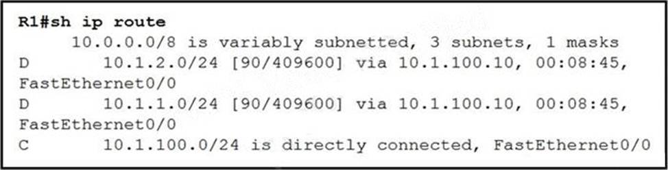 - D . Router 10.1.100.10 should configure ip summary address eigrp (AS number) 10.0.0.0 255.0.0.0 for the R1 Fast Ethernet 0/0 connected interface.