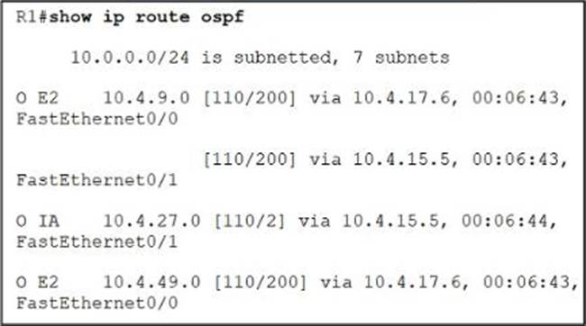 An engineer configures two ASBRs 10 4 17.6 and 10 4 15 5 in an OSPF network to redistribute routes from EIGRP However, both ASBRs show the EIGRP routes as equal costs even though the next-hop router 10 4 17 6 is closer to R1.