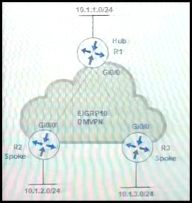 An engineer configures DMVPN and receives the hub location prefix of 10.1.1.0724 on R2 and R3 The R3 prefix of 10 1.3.0/24 is not received on R2. and the R2 prefix 10.1,2.0/24 is not received on R3.
