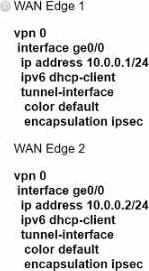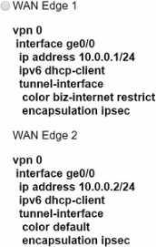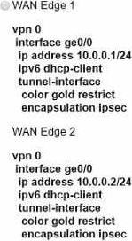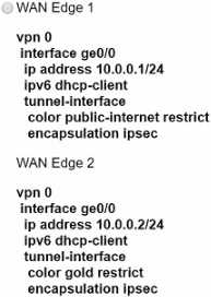 An engineer must configure two branch WAN Edge devices where an Internet connection is available and the controllers are in the headquarters. The requirement is to have IPsec VPN tunnels established between the same colors.