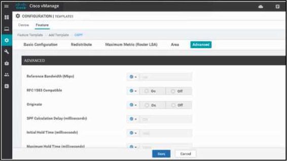 A network administrator is configuring OSPF advanced configuration parameters from a template using the vManager GUI for a branch WAN Edge router to calculate the cost of summary routes to an ASBR.