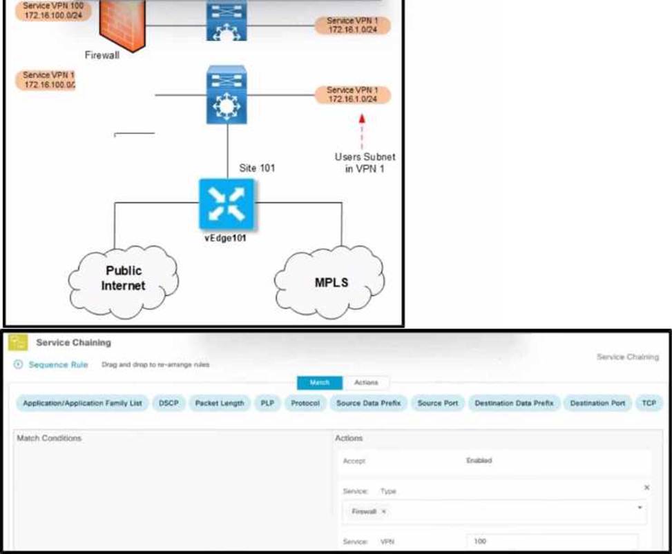 An engineer is creating a policy for VPN1 users. Their scavenger traffic at site 101 must pass through a firewall.